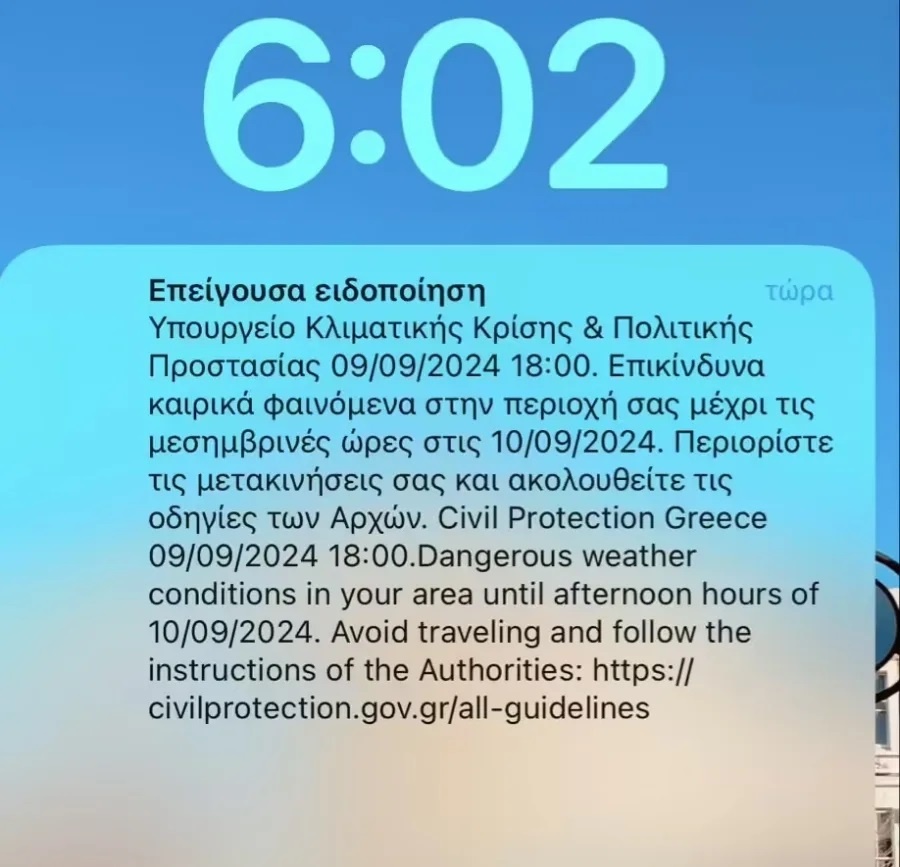 🆘 Προειδοποιητικό μήνυμα για επικίνδυνα καιρικά φαινόμενα στην περιοχή σας τα οποία θα συνεχιστούν μέχρι τις μεσημβρινές ώρες στις 10/09/2024.