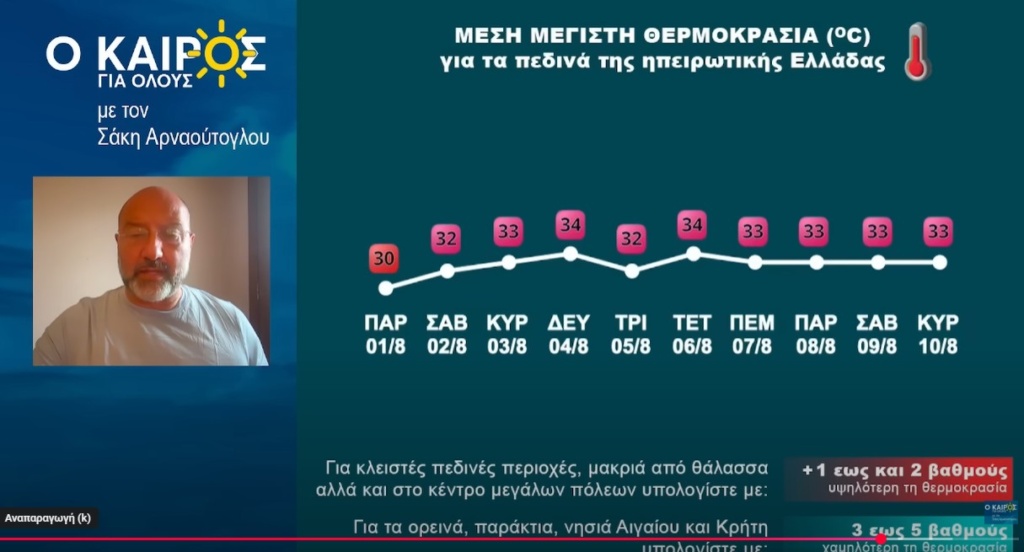 Ο Αύγουστος κάνει ποδαρικό με βροχές, ενώ σύμφωνα με τον προγνώστη καιρού, Σάκη Αρναούτογλου, μέχρι και τις 10 Αυγούστου θα πορευθούμε με θερμοκρασίες κανονικές για την εποχή, με τον υδράργυρο γύρω στους 33 βαθμούς Κελσίου και γύρω στους 35 βαθμούς στις κλειστές περιοχές.