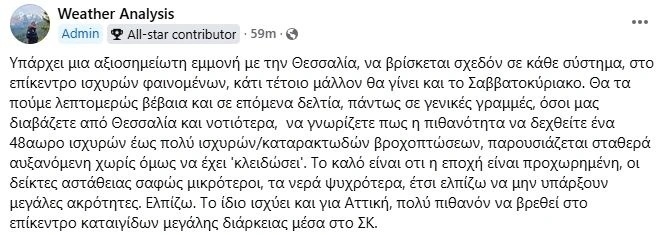 Σύμφωνα με την σελίδα μετεωρολογικών προγνώσεων, Weather Analysis, το σύστημα που επηρεάζει τη χώρα μας το ερχόμενο Σαββατοκύριακο φαίνεται πως έχει στο… στόχαστρο την περιοχή της Θεσσαλίας, η οποία θα δεχτεί ένα 48ώρο πολύ έντονων βροχωπτώσεων.