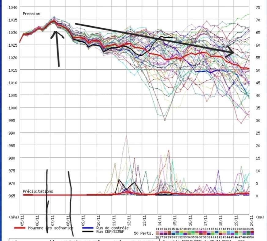 Το 24ωρο 7ης και 8ης μέρας του Νοέμβρη θα έχει και τις υψηλότερες τιμές βαρομετρικής πίεσης για το επόμενο διάστημα και ελπίζω για το υπόλοιπο του μήνα. Από την 8η και μετά, φαίνεται μια αργή και βασανιστική πτώση των βαρομέτρων , ως αποτέλεσμα της σταδιακής κατάρρευσης (?) του αντικυκλώνα.
