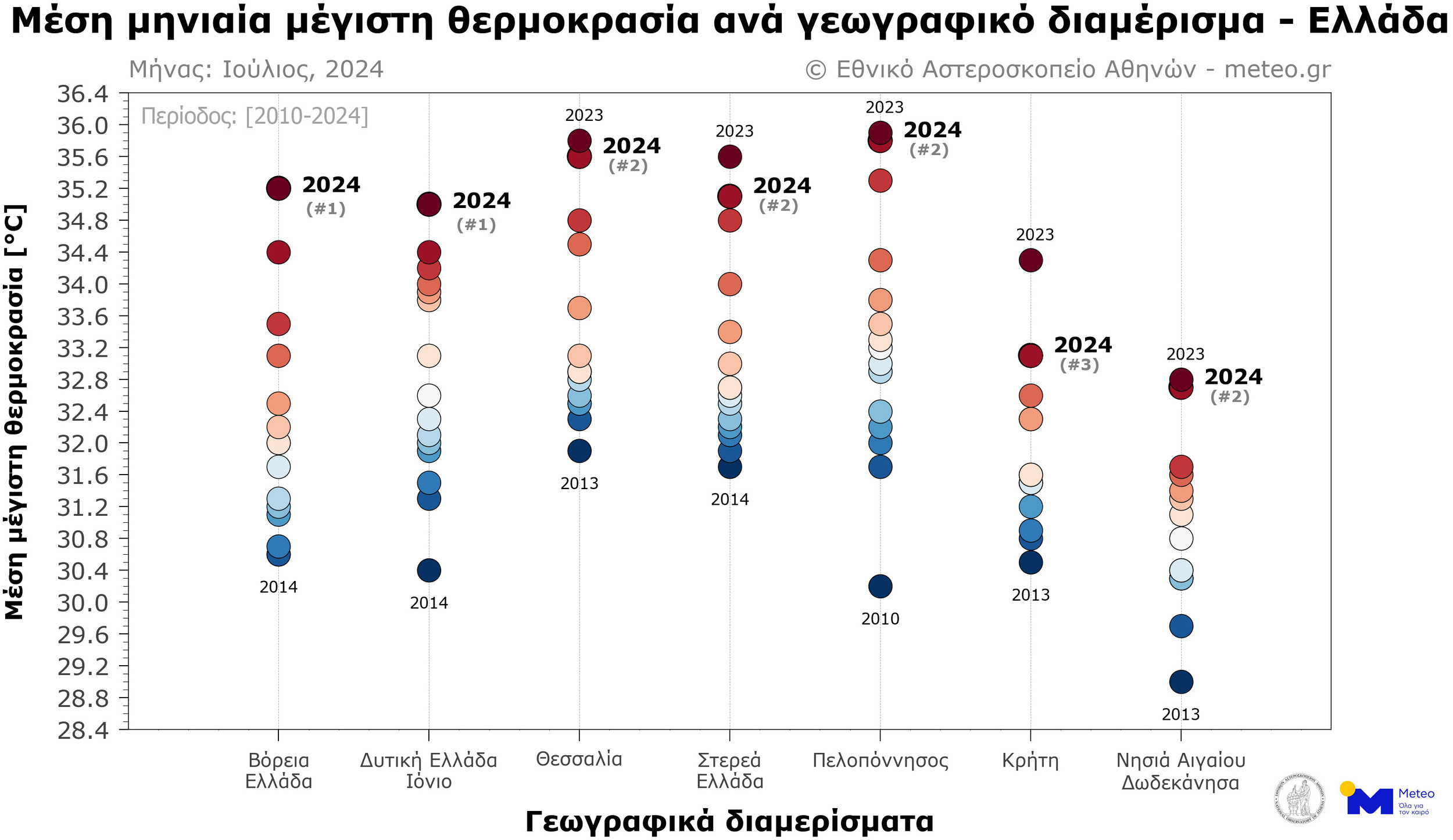 Το επόμενο γράφημα παρουσιάζει την κατάταξη του μήνα Ιουλίου ανά έτος, ανάλογα με τη μέση μηνιαία τιμή της μέγιστης θερμοκρασίας. Ο Ιούλιος του 2024 ήταν ένας πολύ θερμός μήνας σε συνέχεια του ακραία θερμού Ιουνίου 2024, με τις μέσες τιμές του μήνα να είναι σχεδόν 1-2°C πάνω από τον δεύτερο θερμότερο (Ιούλιος 2023) σε Βόρεια & Δυτική Ελλάδα. Μεγάλες και συνεχόμενες θετικές αποκλίσεις σημειώθηκαν σε όλη την χώρα από τις 7 Ιουλίου έως το τέλος του μήνα, κυρίως σε Βόρεια Ελλάδα, Δυτική Ελλάδα, Ιόνιο και Πελοπόννησο της τάξης των 6-8°C πάνω από τα κανονικά για την εποχή επίπεδα (43.1°C στη Σκάλα Μεσσηνίας στις 18 Ιουλίου 2024). Μικρές αρνητικές αποκλίσεις σημειώθηκαν μόνο στα νησιά του Αιγαίου και στην Κρήτη με την παράλληλη επικράτηση του μελτεμιού.