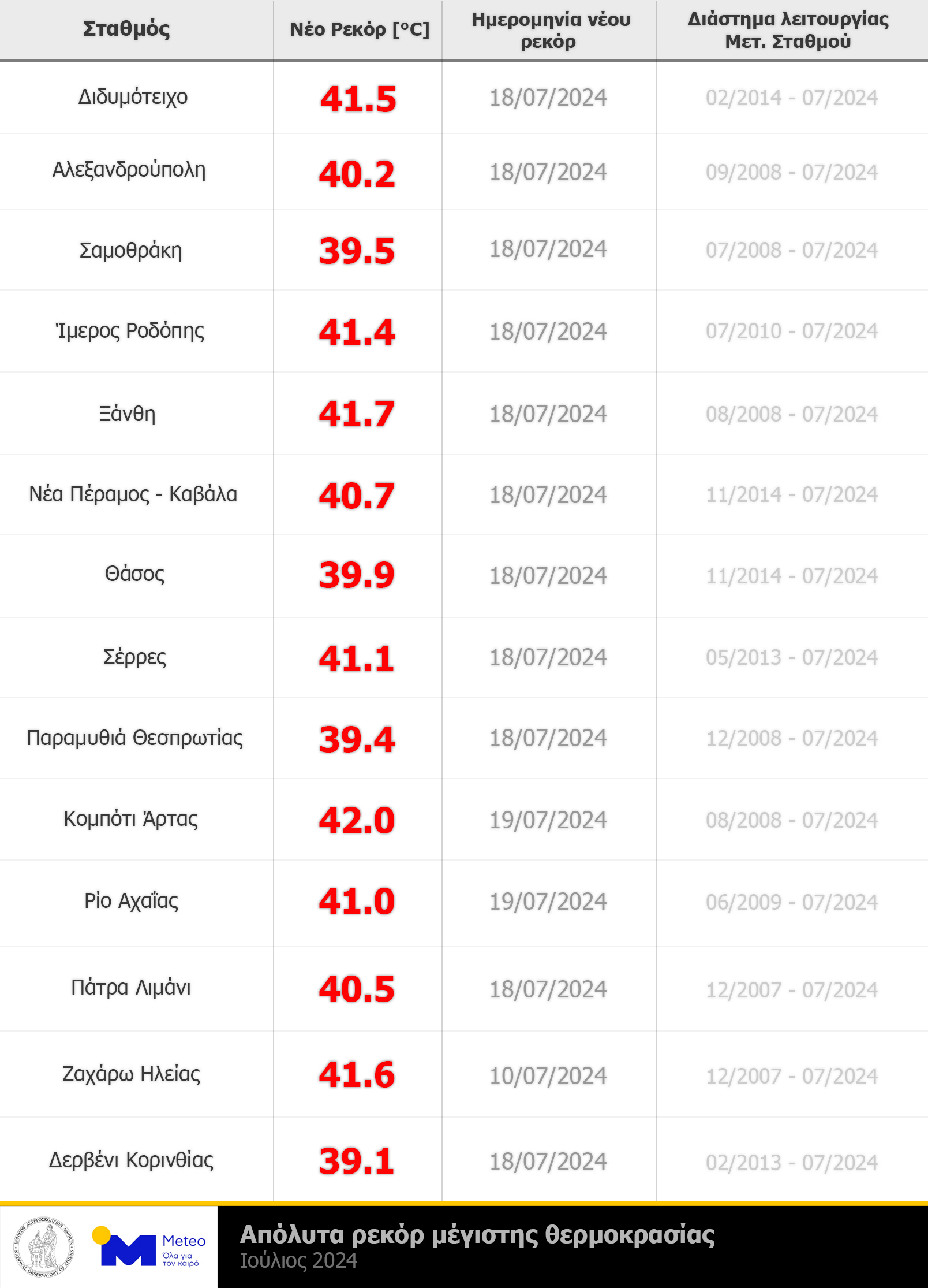 Εκτός, των πολλών και συνεχόμενων ημερών με θετικές αποκλίσεις, καταρρίφθηκαν και σημαντικά απόλυτα ρεκόρ μέγιστης θερμοκρασίας σε αρκετούς σταθμούς του δικτύου αυτόματων μετεωρολογικών σταθμών του Εθνικού Αστεροσκοπείου Αθηνών / meteo.gr. Στον παρακάτω πίνακα παρουσιάζονται μερικά από αυτά τα απόλυτα ρεκόρ μέγιστης θερμοκρασίας που καταγράφηκαν τον Ιούλιο 2024.