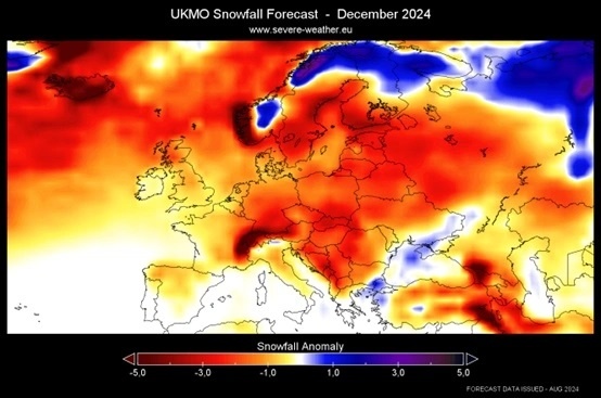 Η πρόβλεψη Δεκεμβρίου δείχνει λιγότερες χιονοπτώσεις από το κανονικό σε μεγάλο μέρος της ηπείρου. Η μόνη περιοχή με περισσότερες χιονοπτώσεις είναι πάνω από τις Άλπεις και στη βόρεια Σκανδιναβία.