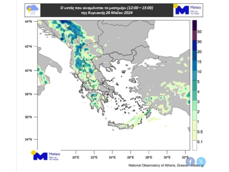 Τα φαινόμενα θα είναι εξασθενημένα κατά τη διάρκεια της νύχτας του Σαββάτου 25/05 προς Κυριακή 26/05 καθώς και το πρωί της Κυριακής 26/05 και θα παρουσιάσουν νέα ενίσχυση από το μεσημέρι της Κυριακής 26/05. Στους χάρτες που ακολουθούν παρουσιάζεται ενδεικτικά ο υετός που αναμένεται τις πρώτες απογευματινές ώρες του Σαββάτου 25/05 και το μεσημέρι της Κυριακής 26/05.