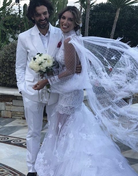 Η Αθηνά Οικονομάκου, για τη μεγάλη της ημέρα, φόρεσε ένα νεραϊδένιο νυφικό με διαφάνειες δια χειρός, επίσης, Σήλιας Κριθαριώτη. Πρόκειται για ένα εντυπωσιακό mermaid φόρεμα, φτιαγμένο από γαλλικές δαντέλες και πουά μεταξωτό τούλι κεντημένο στο χέρι με φτερά στρουθοκάμηλου.