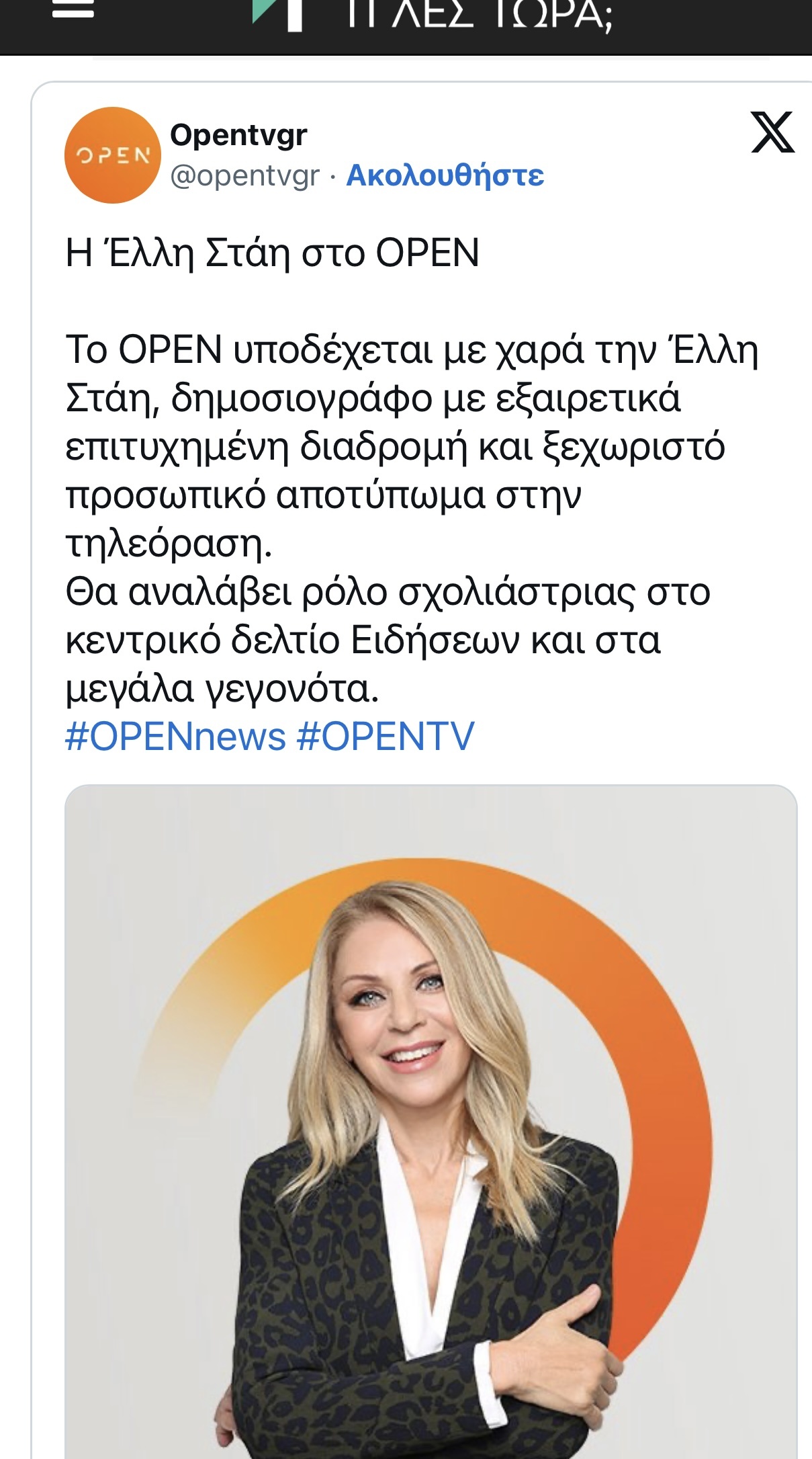 Το OPEN υποδέχεται με χαρά την Έλλη Στάη, δημοσιογράφο με εξαιρετικά επιτυχημένη διαδρομή και ξεχωριστό προσωπικό αποτύπωμα στην τηλεόραση.