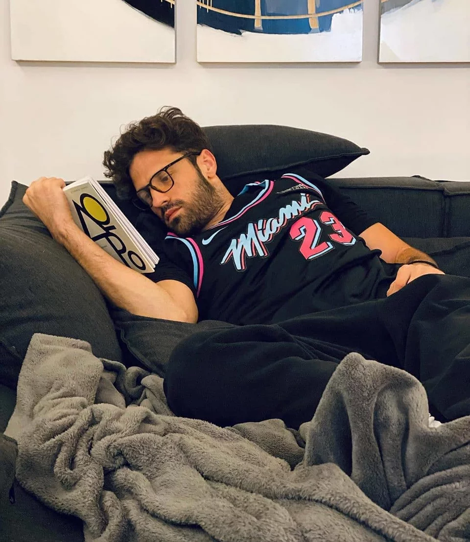 Επιπλέον στο σαλόνι του, υπάρχει ένας μεγάλος αναπαυτικός καναπές σε σκούρο χρώμα, ενώ το πάτωμα είναι καλυμμένο με ένα γκρι χαλί. Γενικότερα στο σπίτι κυριαρχούν ουδέτερα χρώματα, με μία ιδιαίτερη αγάπη στο λευκό, το οποίο «σπάει» με πιο σκούρες λεπτομέρειες.