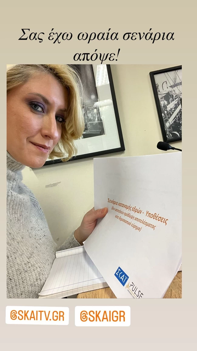 Αργότερα μας έδειξε ένα στιγμιότυπο από το γραφείο της στον ΣΚΑΪ λίγο πριν βγει στον αέρα για το δελτίο ειδήσεων όπου την είδαμε με ζεστό γκρι ανοιχτό πουλόβερ και εντυπωσιακό μακιγιάζ.