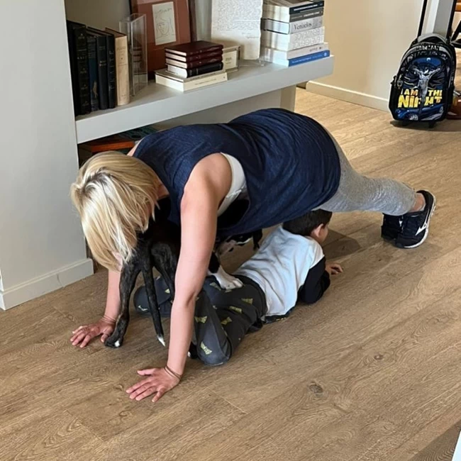 Φορώντας ένα γκρι κολάν, μπλε τοπ και sneakers, η δημοσιογράφος έκανε την άσκηση “σανίδα” με τον γιο της μαζί με τον σκύλο τους να στέκεται από κάτω της.
