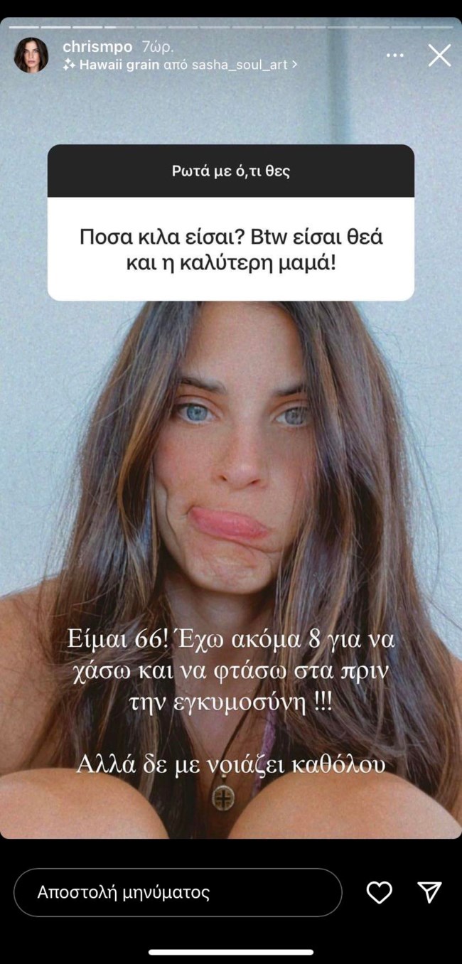 «Είμαι 66! Έχω ακόμα 8 για να χάσω και να φτάσω στα πριν την εγκυμοσύνη!!! Αλλά δε με νοιάζει καθόλου», απάντησε η Χριστίνα Μπόμπα σε ερώτηση follower της.