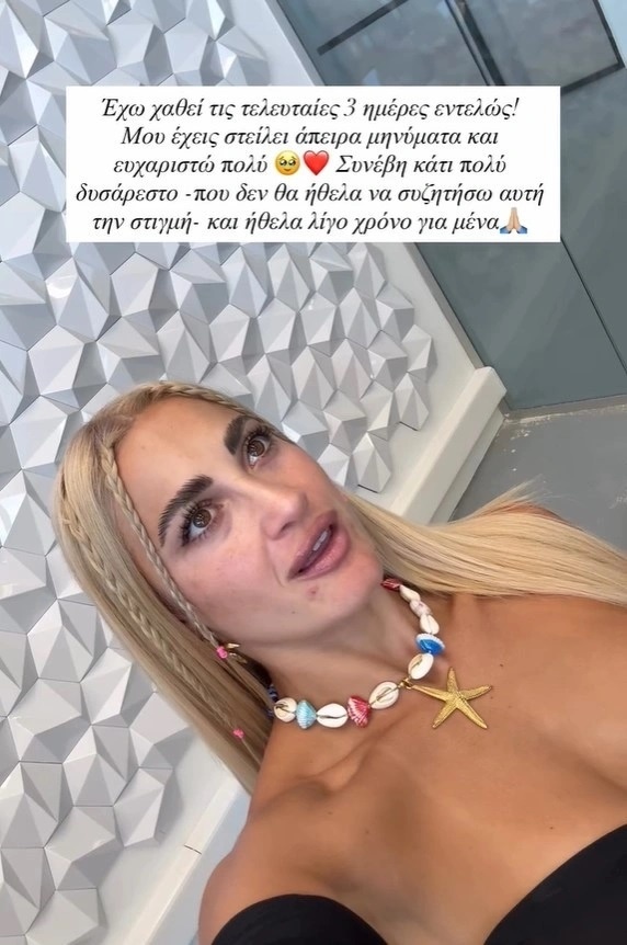 «Έχω χαθεί τις τελευταίες τρεις ημέρες εντελώς. Μου έχεις στείλει άπειρα μηνύματα και ευχαριστώ πολύ. Συνέβη κάτι πολύ δυσάρεστο, που δεν θα ήθελα να συζητήσω αυτή τη στιγμή και θα ήθελα λίγο χρόνο για εμένα», είπε η Ιωάννα Τούνη στο βίντεο της.