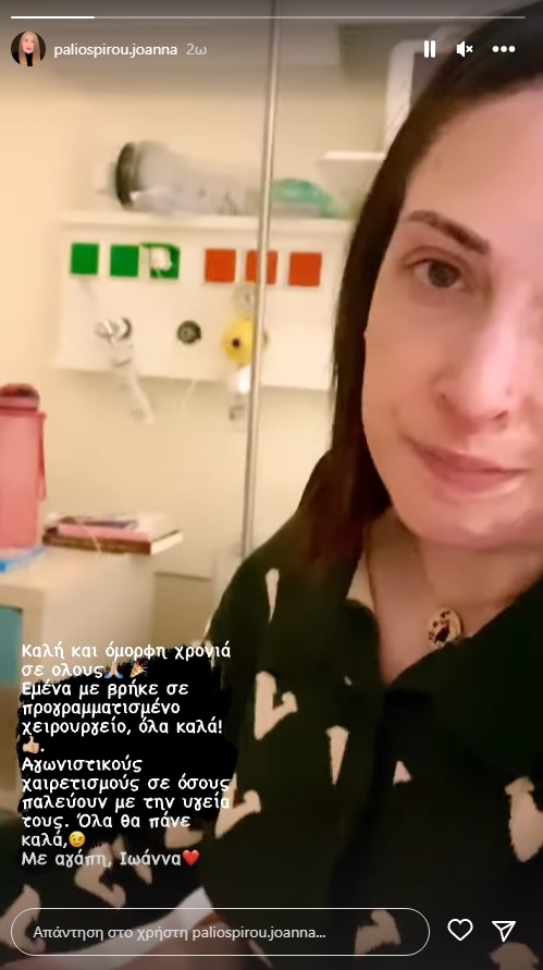 «Καλή και όμορφη χρονιά σε όλους. Εμένα με βρήκε σε προγραμματισμένο χειρουργείο όλα καλά. Αγωνιστικούς χαιρετισμούς σε όσους παλεύουν με την υγεία τους όλα θα πάνε καλά. Με αγάπη Ιωάννα», έγραψε η Ιωάννα ποστάροντας μια φωτογραφία μέσα από το νοσοκομείο.