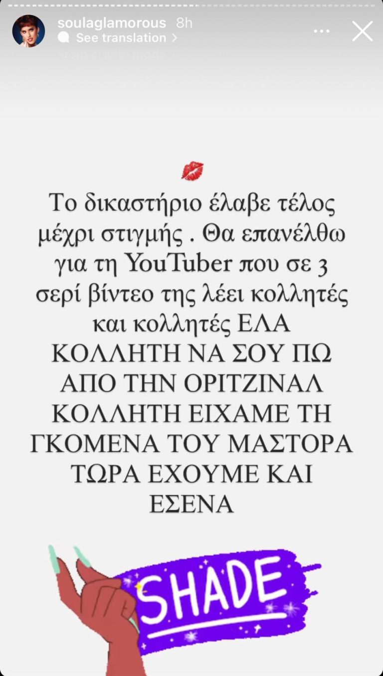 «Το δικαστήριο έλαβε τέλος μέχρι στιγμής. Θα επανέρθω για τη Youtuber που σε τρία σερί βίντεο της λέει κολλητές και κολλητές. ΕΛΑ ΚΟΛΛΗΤΗ ΝΑ ΣΟΥ ΠΩ ΑΠΟ ΤΗΝ ΟΡΙΤΖΙΝΑΛ ΚΟΛΛΗΤΗ ΕΙΧΑΜΕ ΤΗΝ ΓΚΟΜΕΝΑ ΤΟΥ ΜΑΣΤΟΡΑ ΤΩΡΑ ΕΧΟΥΜΕ ΚΑΙ ΣΕΝΑ», έγραψε η Soula φωτογραφίζοντας την Γαρυφαλλιά Καληφώνη.