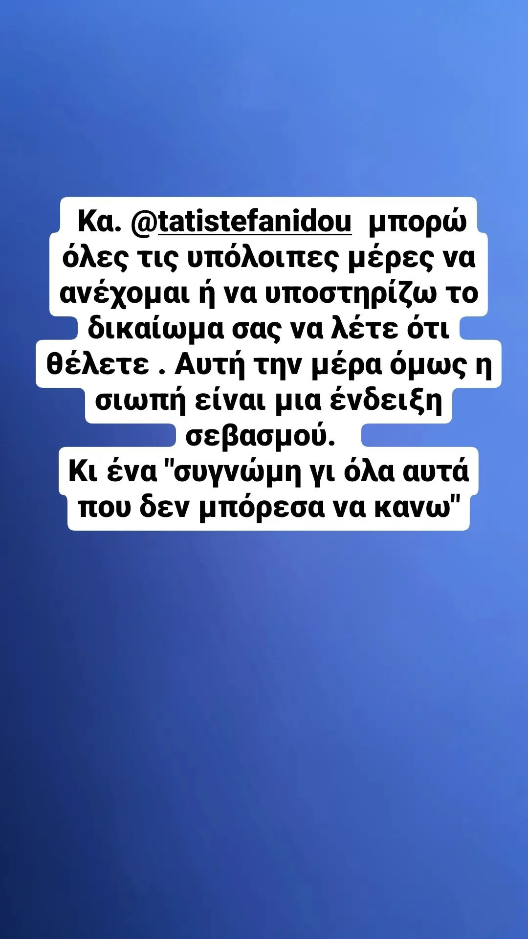 Από την πλευρά του, ο Μάριος Αθανασίου δεν άφησε ασχολίαστα τα όσα είπε η Τατιάνα Στεφανίδου και ξέσπασε μ’ ένα story στον προσωπικό του λογαριασμό στο instagram, γράφοντας «Κυρία Στεφανίδου μπορώ όλες τις υπόλοιπες ημέρες να ανέχομαι ή να υποστηρίζω το δικαίωμά σας να λέτε ότι θέλετε. Αυτή την ημέρα η σιωπή είναι ένδειξη σεβασμού. Κι ένα “συγγνώμη για όλα όσα δεν μπόρεσε να κάνω”».