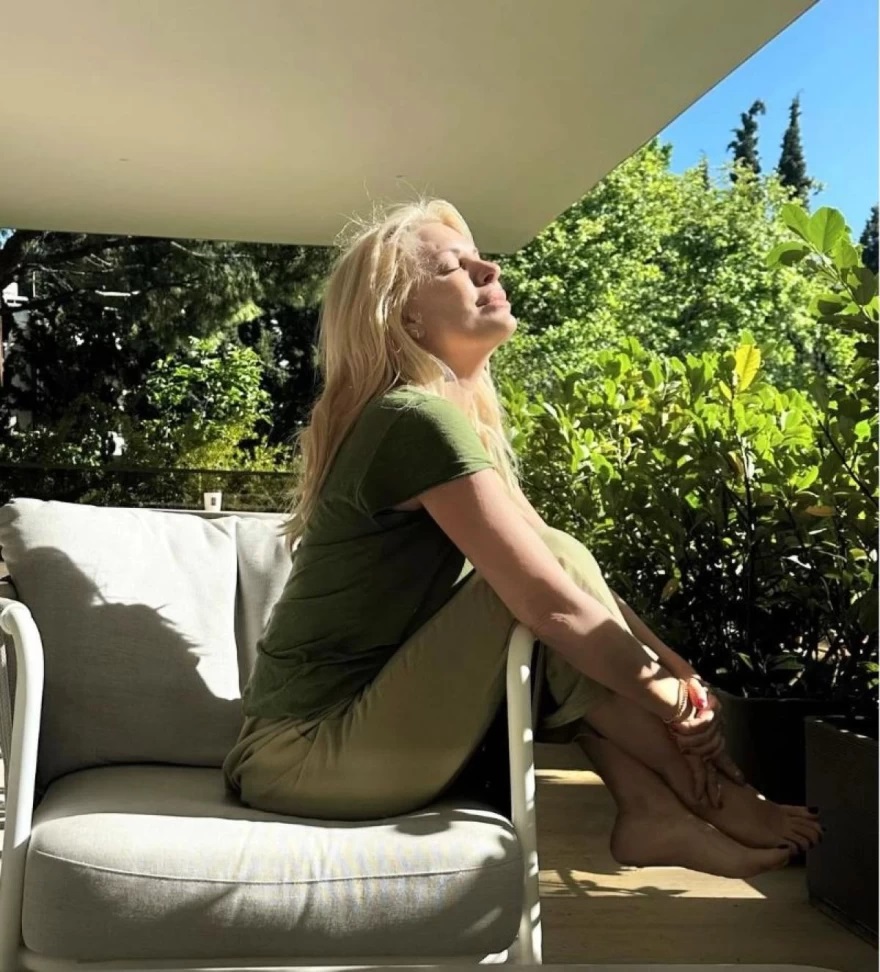 Η Ελένη Μενεγάκη πόζαρε στην βεράντα της φορώντας άνετα ρούχα και ξυπόλυτη απολαμβάνοντας τον ήλιο.