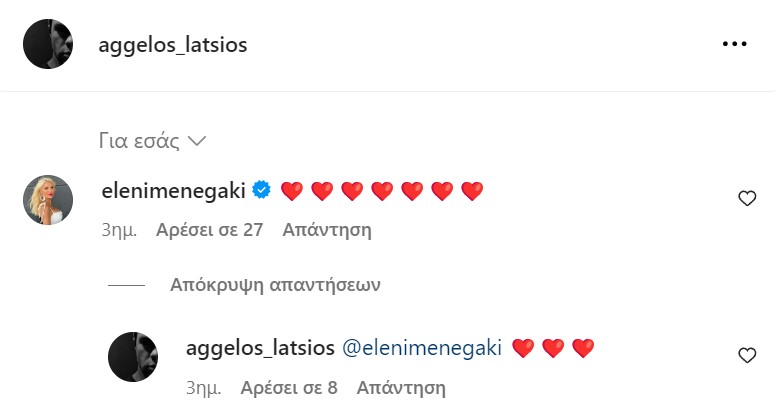 Η Ελένη Μενεγάκη άφησε ένα σχόλιο με πολλές καρδιές στη φωτογραφία του γιου της και εκείνος με τη σειρά του της απάντησε αντίστοιχα.