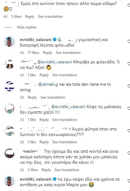 «Εμείς στο survivor όταν ήσουν, άλλο σώμα είδαμε». Αυτό ήταν το σχόλιο που έκανε την Ευρυδίκη Βαλαβάνη να απαντήσει στο Instagram.