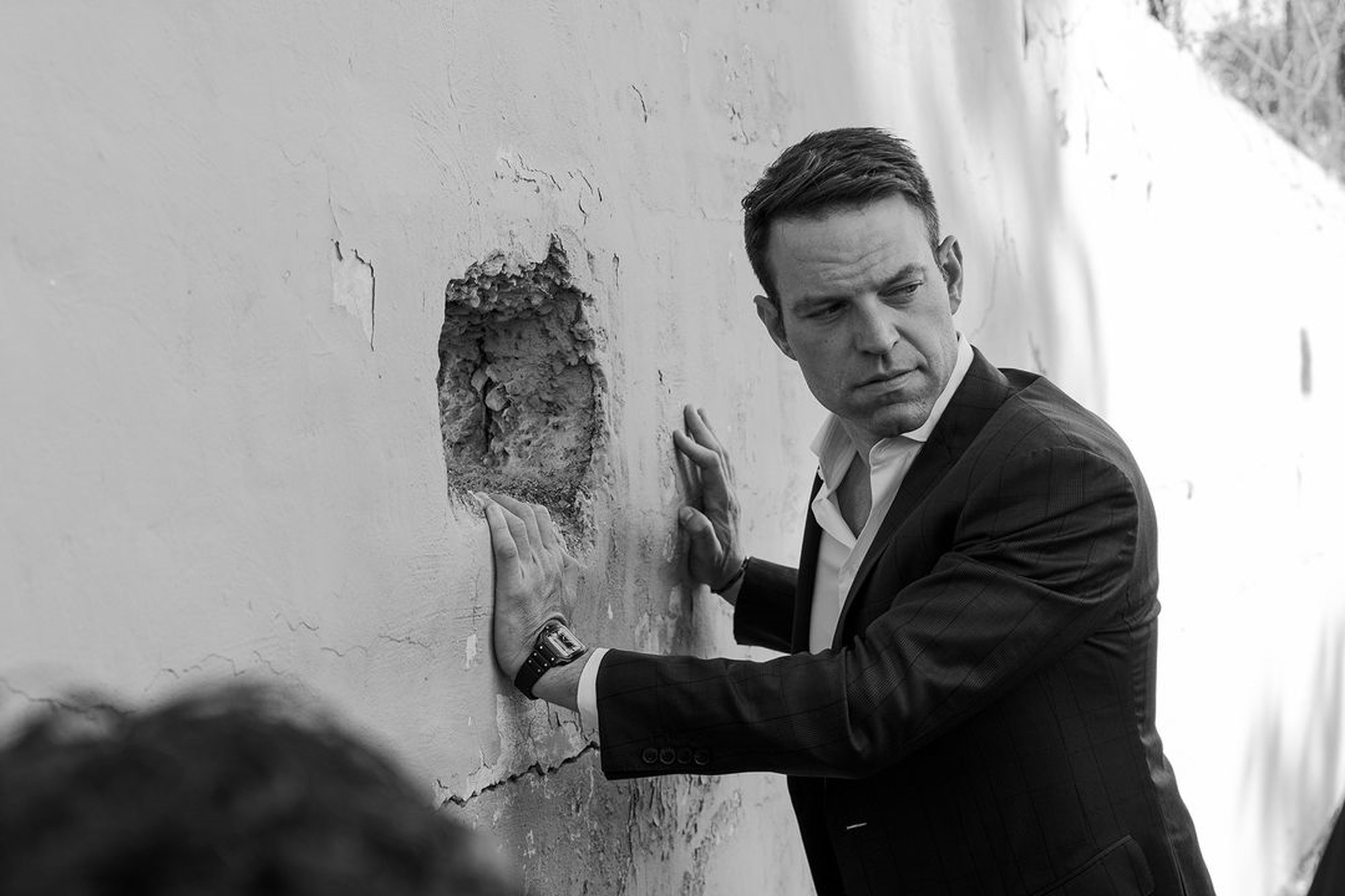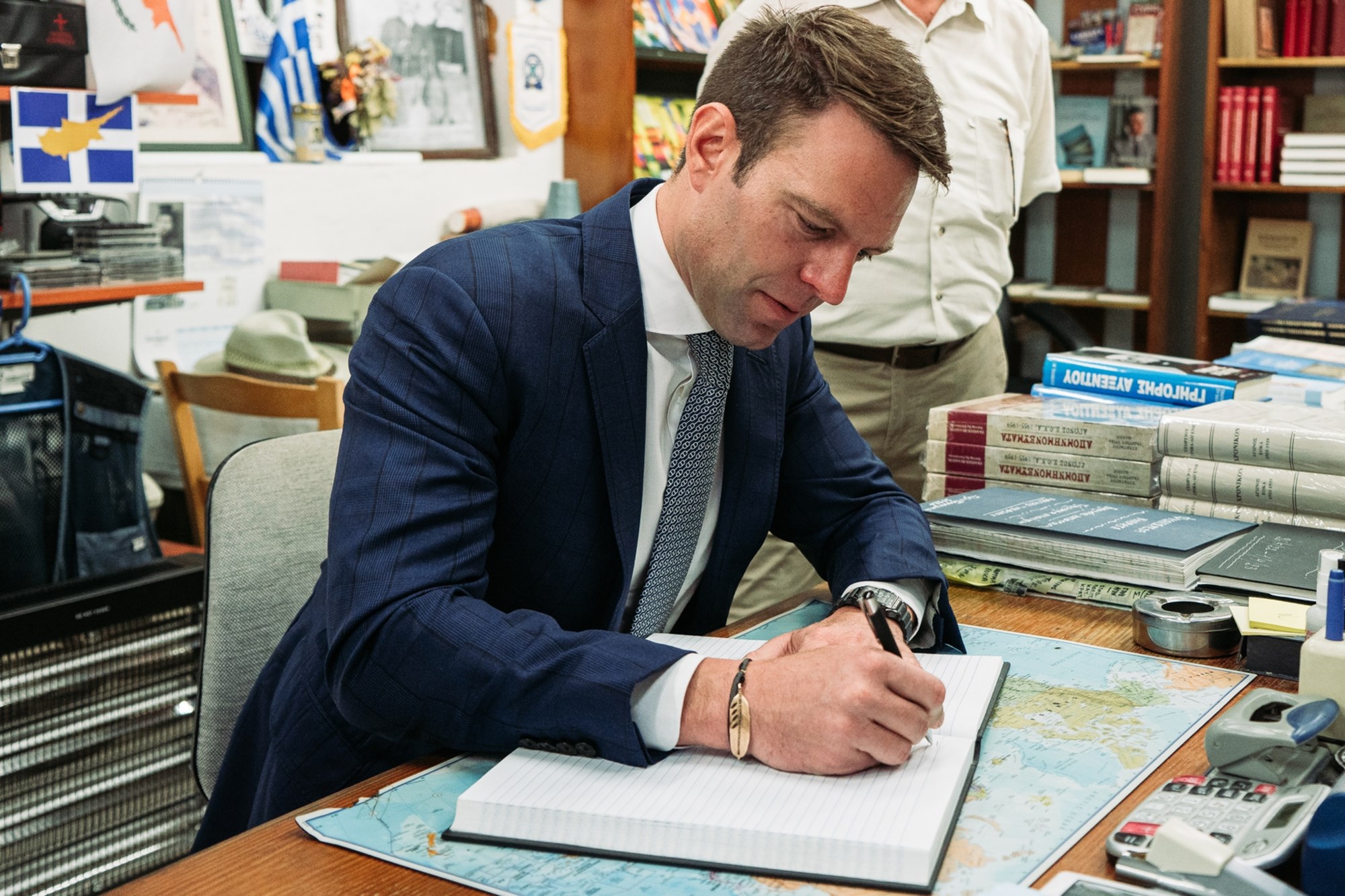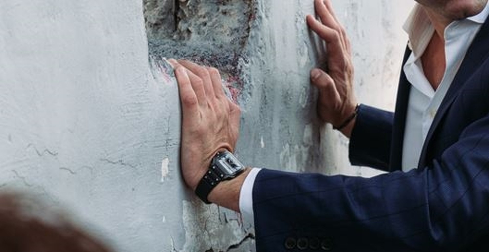 Ο Στέφανος Κασσελάκης ποζάρει πάνω στον κατεστραμμένο τοίχο της νεκρής ζώνης, από όπου φαίνεται η Κατεχόμενη Λευκωσία, ενώ τον αριστερό του καρπό κοσμεί το πανάκριβο ρολόι.