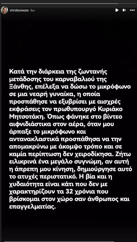 «Κατά τη διάρκεια της ζωντανής μετάδοσης του καρναβαλιού της Ξάνθης, επέλεξα να δώσω το μικρόφωνο σε μία νεαρή γυναίκα, η οποία προσπάθησε να εξυβρίσει με αισχρές εκφράσεις τον πρωθυπουργό Κυριάκο Μητσοτάκη. Όπως φάνηκε στο βίντεο, αιφνιδιάστηκα στον αέρα, όταν μου άρπαξε το μικρόφωνο και αντανακλαστικά προσπάθησα να την απομακρύνω με άκομψο τρόπο και σε καμία περίπτωση δεν χειροδίκησα.