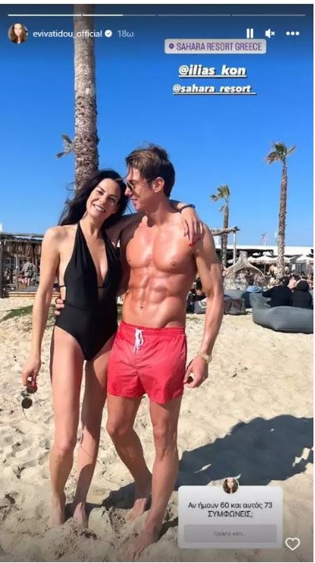 Η Εύη Βατίδου ανέβασε στο instagram τη νέα φωτογραφία από την παραλία με τον Ηλία Κωνσταντίνου. Η ίδια μάλιστα ξεσπώντας για τα σχόλια που έλαβε για τη διαφορά ηλικίας, έγραψε: «Αν ήμουν 60 και αυτός 73 συμφωνείς;».