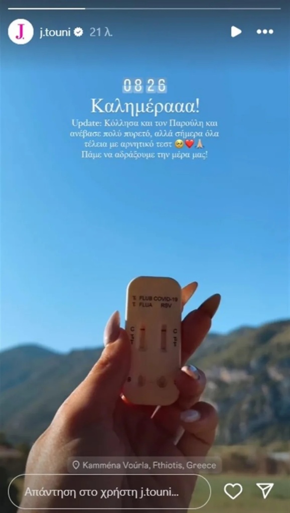 «UPDATE: Κόλλησα και τον Παρούλη και ανέβασε πολύ πυρετό αλλά σήμερα όλα τέλεια με αρνητικό τεστ. Πάμε να αδράξουμε την ημέρα μας», ανέφερε χαρακτηριστικά η Ιωάννα Τούνη δείχνοντας το τεστ.