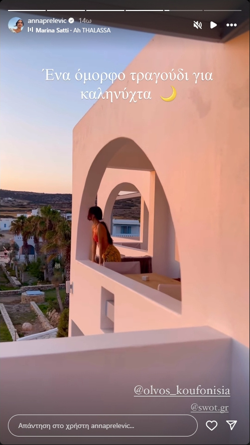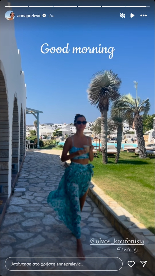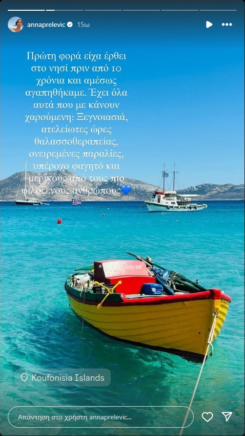 «Πρώτη φορά είχα έρθει στο νησί πριν από 10 χρόνια και αμέσως αγαπηθήκαμε. Έχει όλα αυτά που με κάνουν χαρούμενη: Ξεγνοιασιά, ατέλειωτες ώρες θαλασσοθεραπείας, ονειρεμένες παραλίες, υπέροχο φαγητό και μερικούς από τους πιο φιλόξενους ανθρώπους» έγραψε η Άννα Πρέλεβιτς στο Instagram.