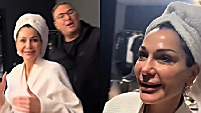 Ωστόσο, η Δέσποινα Βανδή έκανε τη διαφορά και φορώντας μόνο το μπουρνούζι της και με μια πετσέτα στα μαλλιά, χωρίς ίχνος κόμπλεξ, έσπευσε στο καμαρίνι του Αντώνη Ρέμου για να χαιρετήσει τους διαδικτυακούς του φίλους.