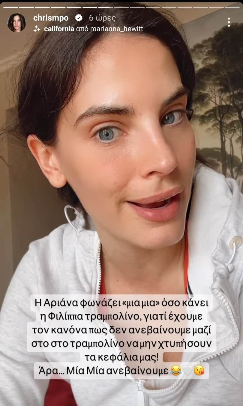 Όπως έσπευσε να εξηγήσει η influencer «η Αριάνα φωνάζει «μία μία» όσο κάνει η Φιλίππα τραμπολίνο, γιατί έχουμε τον κανόνα πώς δεν ανεβαίνουμε μαζί στο τραμπολίνο να μην χτυπήσουν τα κεφάλια μας! Αρα … Μία Μία ανεβαίνουμε».