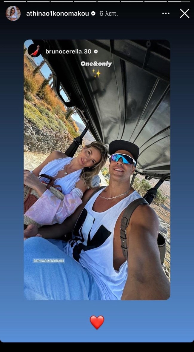 Το ζευγάρι, απόλαυσε τις διακοπές του στην Ελλάδα και συγκεκριμένα στη Τζια. Την αποκάλυψη έκανε ο Μπρούνο Τσερέλα μέσα από τον προσωπικό του λογαριασμό στο Instagram, δημοσιεύοντας φωτογραφίες από το ίδιο ξενοδοχείο με την Αθηνά Οικονομάκου