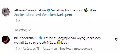Ο Μπρούνο Τσερέλα δεν παρέλειψε να σχολιάσει τις κοινές διακοπές του με την Αθηνά Οικονομάκου κάνοντας ένα σχόλιο κάτω από ανάρτησή της.