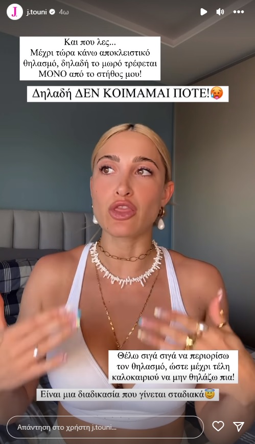 Η Ιωάννα Τούνη έφερε στον κόσμο τον γιο της πριν από πέντε μήνες και η ζωή της, όπως έχει πει κατά καιρούς η ίδια, άλλαξε ριζικά. Μάλιστα, η ίδια μέσα από τα stories της στο Instagram ανακοίνωσε ότι αποφάσισε να περιορίσει τον θηλασμό και αναφέρθηκε στις δυσκολίες που περνά.