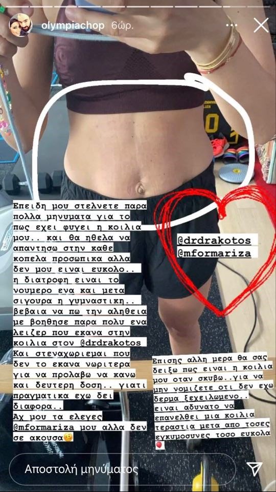 Η Ολυμπία Χοψονίδου ουκ ολίγες φορές έχει μοιραστεί μαζί μας τις διατροφικές της συνήθειες ενώ έχει αποκαλύψει και το γεγονός ότι στο παρελθόν είχε κάνει λέιζερ στην κοιλιά το οποίο την βοήθησε στην δερματική χαλάρωση.