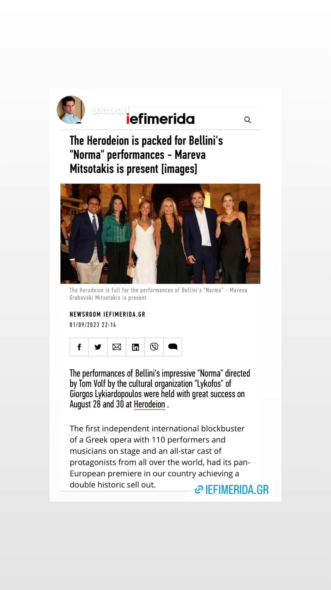 Στις 28 και 30 Αυγούστου στο Ηρώδειο, πραγματοποιήθηκαν οι παραστάσεις της εντυπωσιακής «Νόρμα» του Μπελίνι σε σκηνοθεσία Tom Volf από τον πολιτιστικό οργανισμό «Λυκόφως» του Γιώργου Λυκιαρδόπουλου και το παρών έδωσε η σύζυγος του Πρωθυπουργού της Ελλάδος, Μαρέβα Γκραμπόφσκι – Μητσοτάκη.