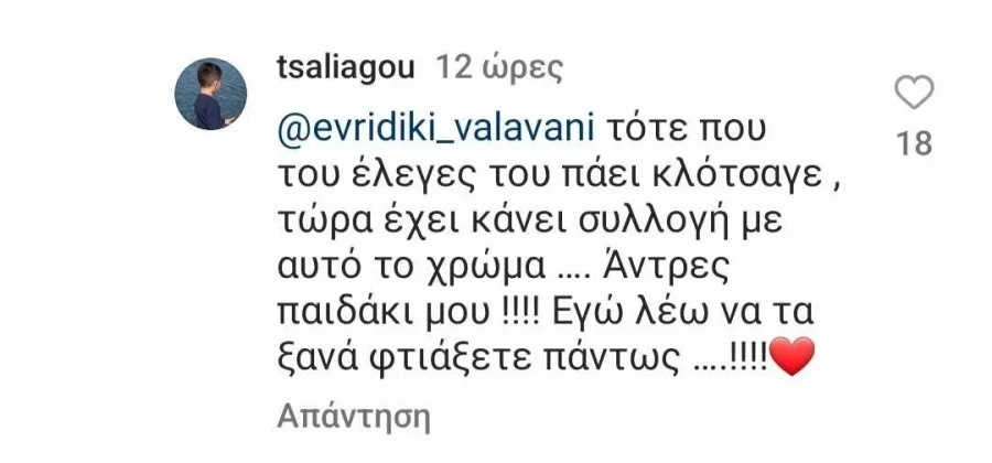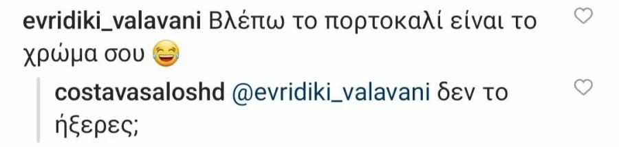 Βέβαια, μια ακόλουθος του Κωνσταντίνου Βασάλου έγραψε το εξής σχετικά με το χρώμα πορτοκαλί και τη «σχέση» που έχει με το ζευγάρι: «@evridiki_valavani τότε που του έλεγες του πάει κλότσαγε, τώρα έχει κάνει συλλογή με αυτό το χρώμα …. Άντρες παιδάκι μου !!!! Εγώ λέω να τα ξανά φτιάξετε πάντως ….!!!!».