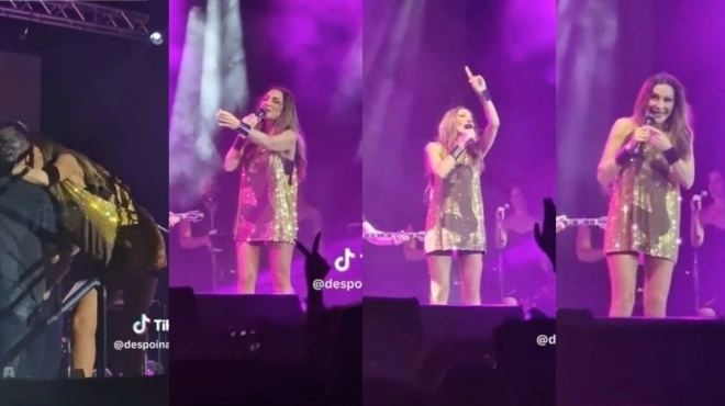 Εκείνη τη στιγμή, η τραγουδίστρια έκανε μια απρόσμενη έκπληξη. Έφυγε από τη σκηνή, κατέβηκε κοντά στο κοινό και αντάλλαξε ένα τρυφερό φιλί με τον Μπισμπίκη.