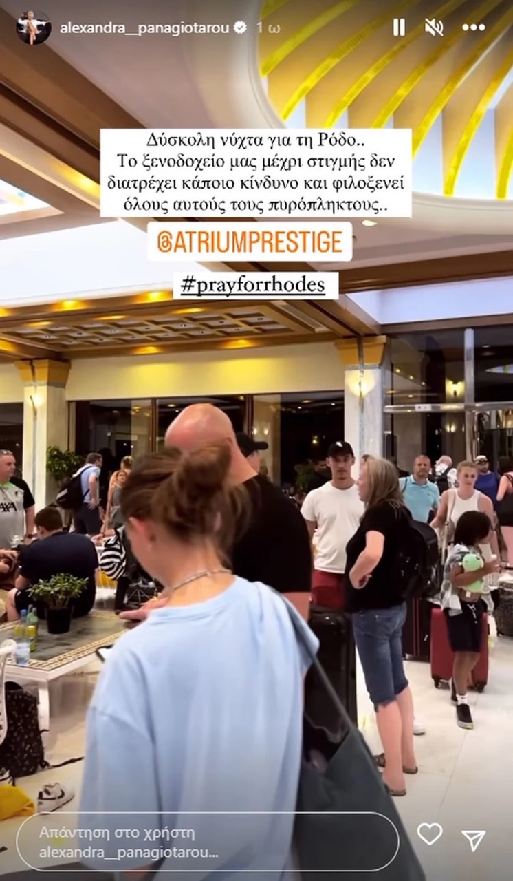 «Δύσκολη νύχτα για τη Ρόδο. Το ξενοδοχείο μας μέχρι στιγμής δεν διατρέχει κάποιο κίνδυνο και φιλοξενεί όλους αυτούς τους πυρόπληκτους», γράφει συνοδευτικά με το βίντεο η Αλεξάνδρα Παναγιώταρου.