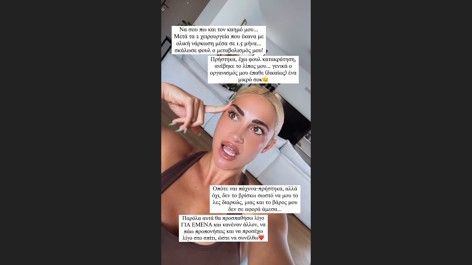 Η γνωστή Influencer θέλησε να εξομολογηθεί μέσα από τα social media, τα θέματα που αντιμετωπίζει με τον μεταβολισμό της, εξαιτίας των δύο χειρουργείων που έκανε – στη μύτη αλλά και στο στήθος της.