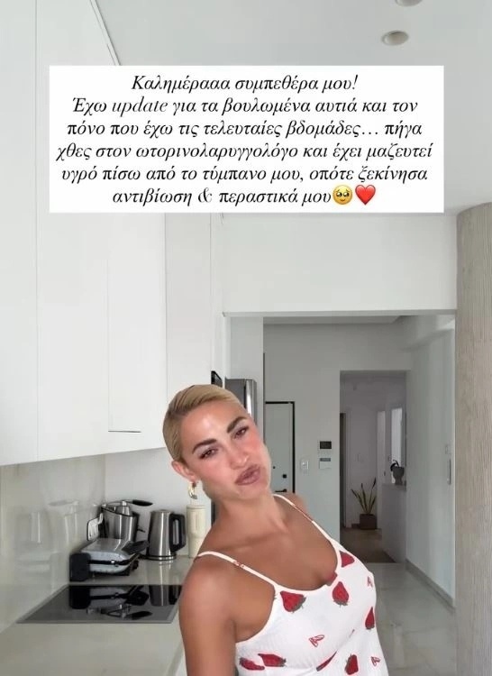 «Πήγα χθες στον ωτορινογκολόγο και έχει μαζευτεί υγρό πίσω από το τύμπανό μου, οπότε ξεκίνησα αντιβίωση και περαστικά μου», αναφέρει στο βίντεο η Ιωάννα Τούνη.
