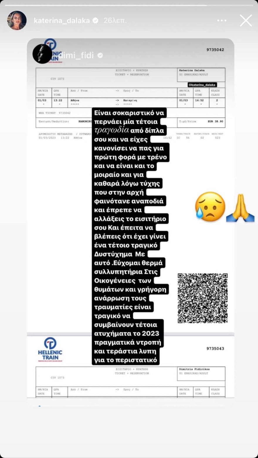 Η Κατερίνα Δαλάκα και ο Δημήτρης Φιντιρίκος είχαν εκδώσει εισιτήρια για να ταξιδέψουν στην Κατερίνη για να επισκεφθούν το πατρικό σπίτι της αθλήτριας, με σκοπό να πάρουν το αυτοκίνητο της που είχε αφήσει στους γονείς της. Τελευταία στιγμή όμως το ταξίδι τους ακυρώθηκε λόγω επαγγελματικών υποχρεώσεων του επιχειρηματία και έτσι δε μπήκαν στο μοιραίο τρένο των Τεμπών…