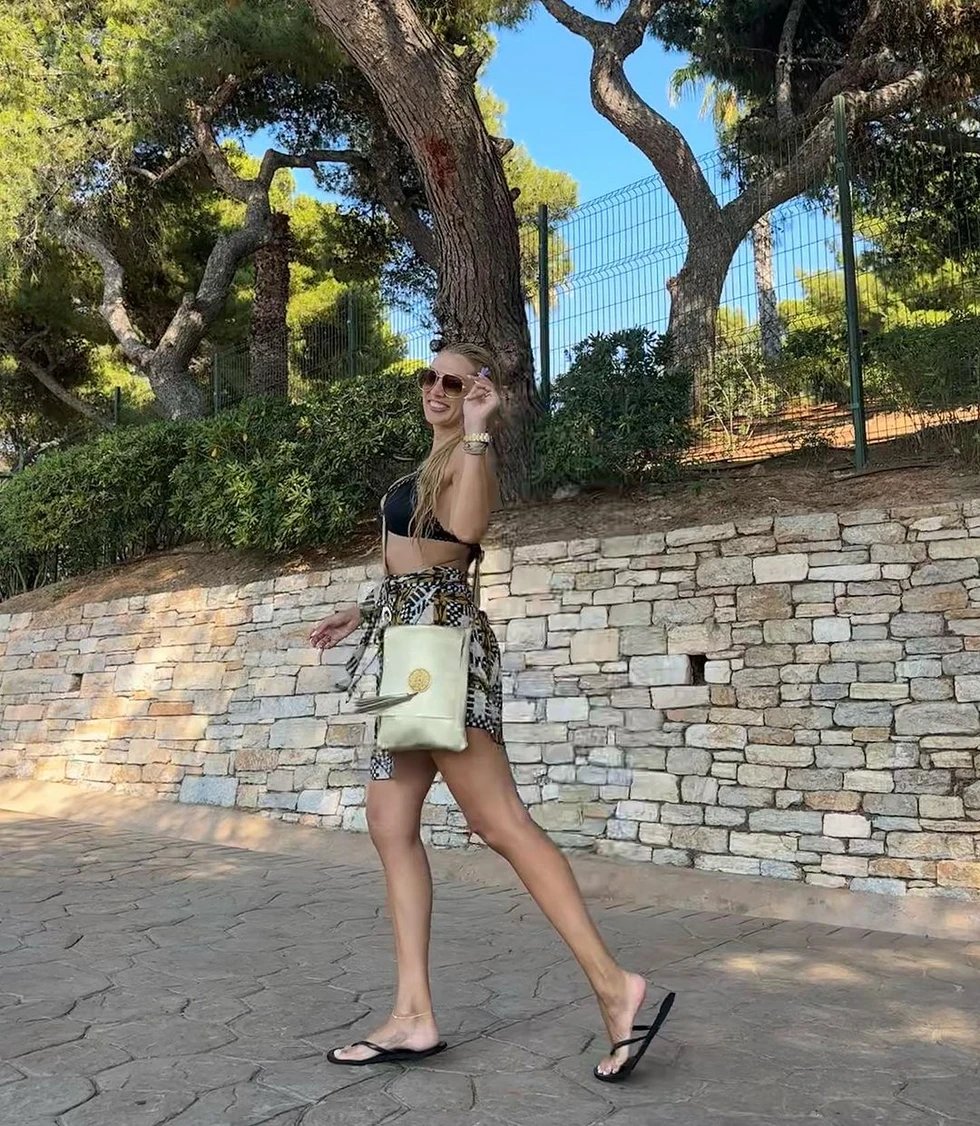 Όπως και σήμερα το πρωί η Κωνσταντίνα επισκέφθηκε στη θάλασσα και τράβηξε όλα τα βλέμματα επάνω της τόσο με το πανέμορφο κορμί της το οποίο μετά από προσπάθεια το έχει φέρει στα επίπεδα προ εγκυμοσύνης αλλά και με το καλοκαιρινό Look της. Η Κωνσταντίνα επέλεξε ένα κομψότατο και διαχρονικό μαύρο μπικίνι συνδυάζοντάς το με μία μίνι φούστα-παρεό με λεοπάρ print. Το σύνολό της ολοκλήρωσε με μία μπεζ τσάντα και μαύρες σαγιονάρες.