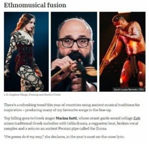 «Υπάρχει μια αναζωογονητική τάση φέτος, καθώς κάποιες χώρες χρησιμοποιούν αρχαίες μουσικές παραδόσεις για έμπνευση – παράγοντας για πολλά από τα αγαπημένα μου τραγούδια όσον αφορά στη σύνθεση. Ξεχωρίζει η Ελληνίδα τραγουδίστρια Μαρίνα Σάττι, της οποίας το avant-garde κολάζ ήχου Zari αναμειγνύει παραδοσιακές ελληνικές μελωδίες με τύμπανα, ρυθμούς reggaeton, σύντομα φωνητικά και ένα σόλο σε έναν αρχαίο περσικό αυλό που ονομάζεται ζουρνάς. “Θα το κάνω με τον δικό μου τρόπο”, δηλώνει, στον “πιο κυριολεκτικό στίχο” αυτής της χρονιάς», γράφει ο Μαρκ Σάβατζ.