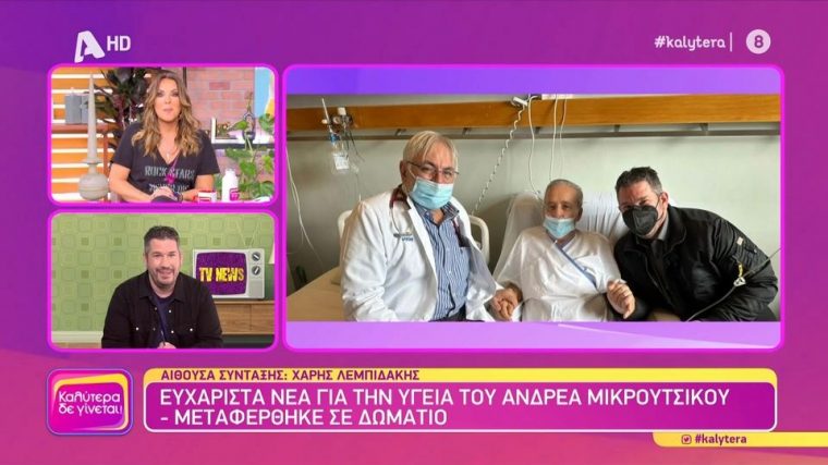 Η σύντροφος του Ανδρέα Μικρούτσικου είχε μιλήσει την Τετάρτη (1/3) στο Happy Day όπου είχε ευχαριστήσει για την αγάπη που έχουν δεχθεί απο τον κόσμο σημειώνοντας πως ο οργανισμός του ανταποκρίθηκε στη θεραπεία των γιατρών και ότι μπορεί η αποσωλήνωση να έγινε μια ημέρα αργότερα από τον αρχικό προγραμματισμό, όμως, αυτό ήταν για το καλό του.