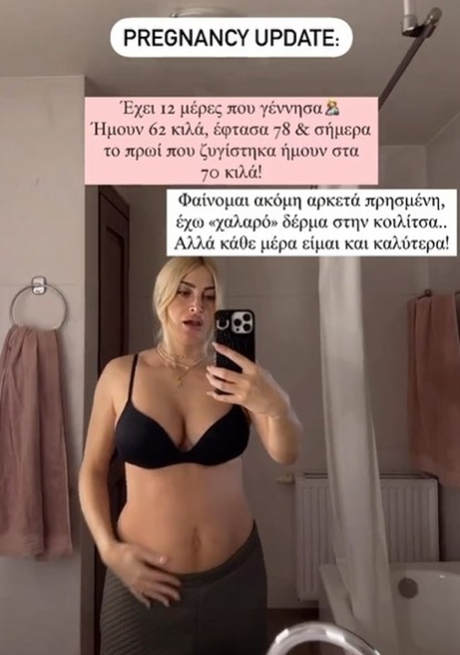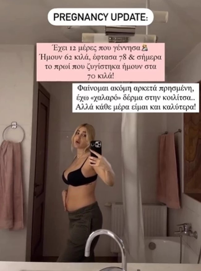«Έχουμε και λέμε, λοιπόν, έχει περίπου 12 μέρες που έχω γεννήσει. Ήμουν 62 κιλά πριν. Έφτασα στα 78-79 κιλά. Σήμερα το πρωί που ζυγίστηκα είμαι στα 70. Δεν έχω ξεκινήσει ακόμα να κάνω διατροφή, γιατί δεν έχω προλάβει. Θα ξεκινήσω, όμως, και θα σας ενημερώσω. Αυτό που έχω προλάβει και κάνω είναι να βάζω φουλ κρέμες. Θα σας τα δείξω κιόλας και προσπαθούμε μέχρι το καλοκαίρι να ξαναγίνει η μέση αυτή μεσούλα. Εντάξει, σε καλό δρόμο είμαστε, αλλά έχουμε, συμπεθέρες».