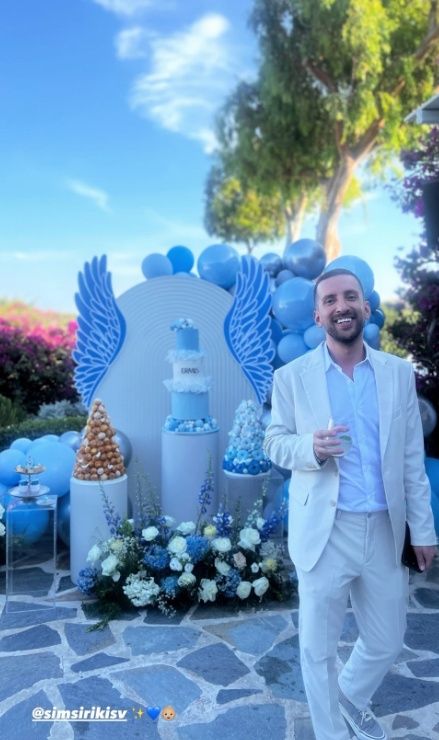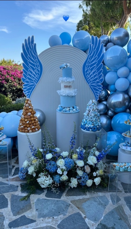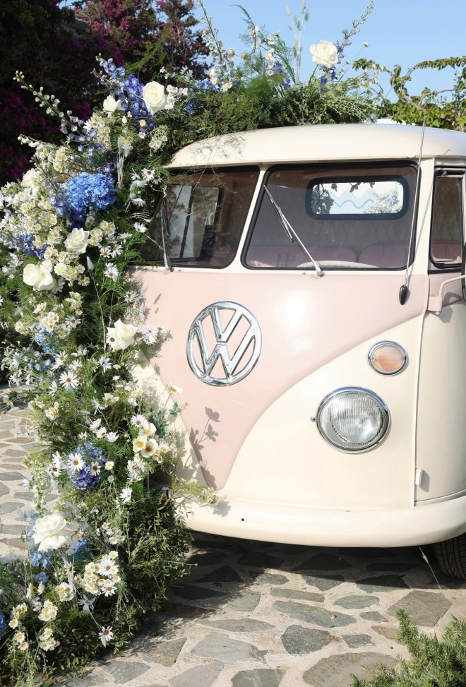Έξω από τον χώρο όπου δινόταν το πάρτι είχε στηθεί ένα μικρό βαν που είχε γεμίσει από μπλε και λευκά λουλούδια ενώ και ο υπόλοιπος στολισμός της βάφτισης ήταν στους ίδιους χρωματισμούς.