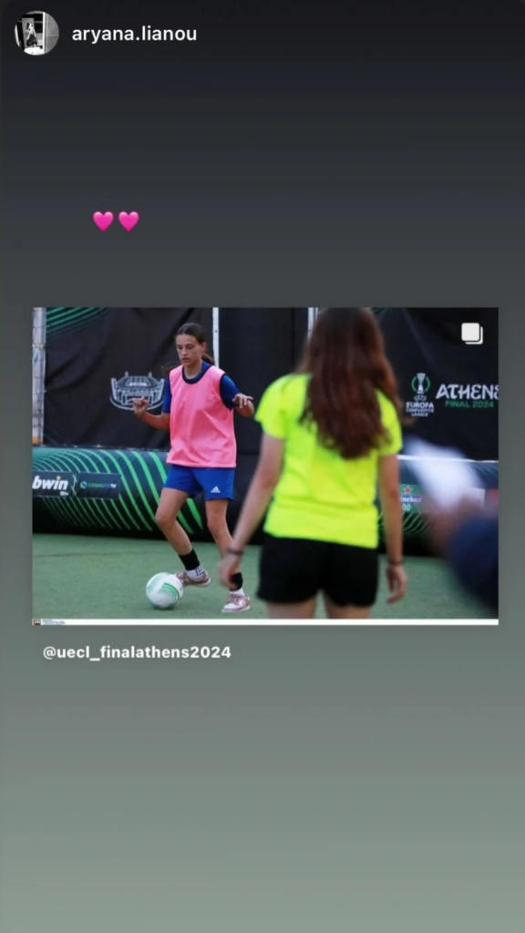 Ο ίδιος δημοσίευσε μια φωτογραφία της να παίζει ποδόσφαιρο στον ειδικά διαμορφωμένο χώρο που είχε δημιουργηθεί ένεκα του τελικού του UEFA Europa Conference League που θα γινόταν στην Αθήνα, προσθέτοντας και κάποια emoji σε σχήμα καρδιάς.