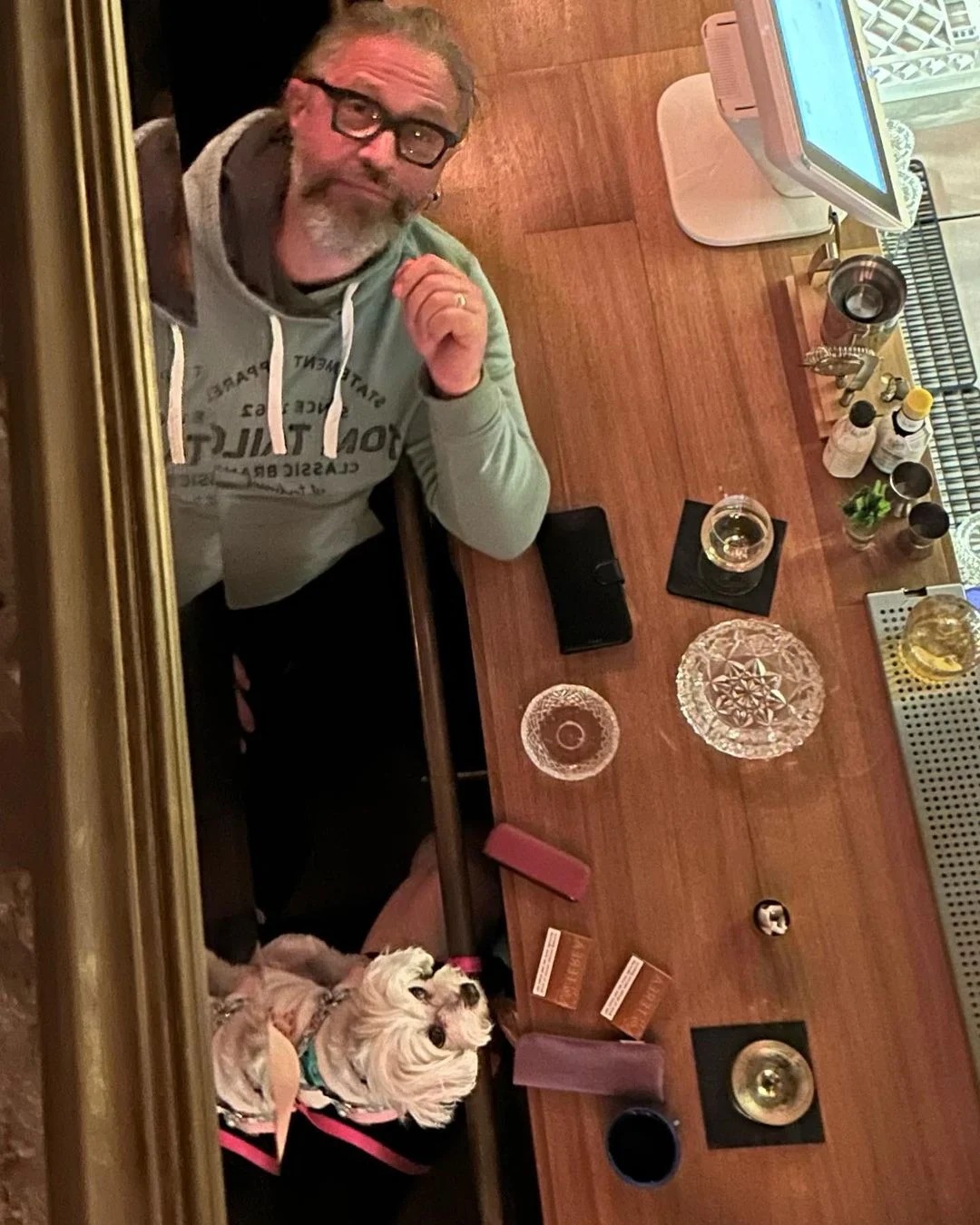 Ο ηθοποιός απολάμβανε το ποτό του σε μπαράκι στα Κύθηρα και η σύζυγός του τον απαθανάτισε με τον τετράποδο φίλος τους. Στη συνέχεια δημοσίευσε τη φωτογραφία στο Instagram γράφοντας: «Οι αγάπες μου πίνουν ένα ποτάκι».