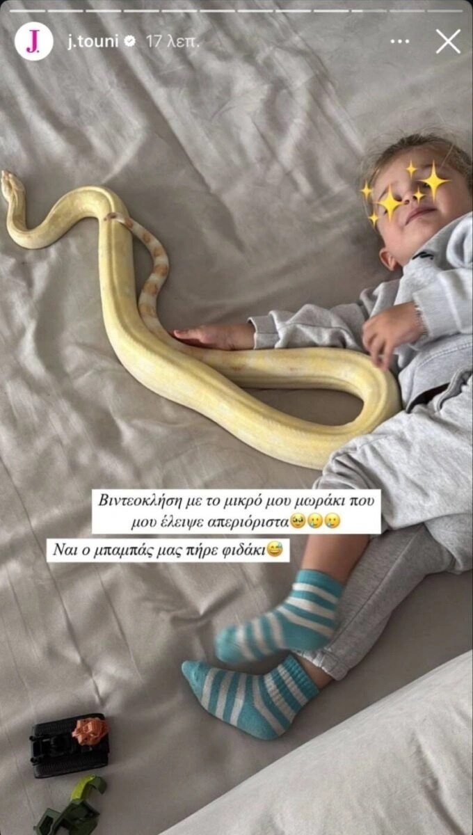 Η φωτογραφία έδειχνε τον γιο της Ιωάννας Τούνη και του Δημήτρη Αλεξάνδρου αγκαλιά με ένα φίδι. «Βίντεο κλήση με το μικρό μου μωράκι που μου έλειψε απεριόριστα. Ναι ο μπαμπάς μας πήρε φιδάκι» έγραψε η Ιωάννα Τούνη.