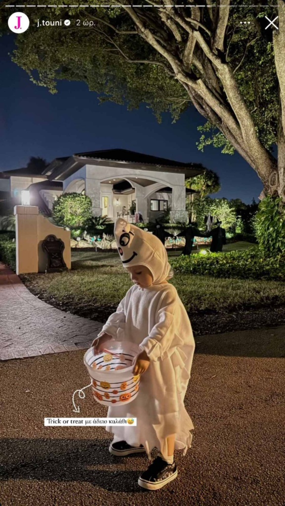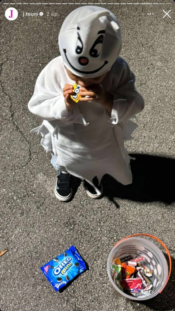 «Κάναμε το πρώτο μας “trick or treat”! Ο Πάρης επειδή είπανε είναι “the cutest” του δώσανε όλα αυτά τα γλυκά. Θα τον αφήσουμε να φάει ένα γλυκάκι, έτσι μωρό μου;», δήλωσε ενθουσιασμένη η Ιωάννα Τούνη