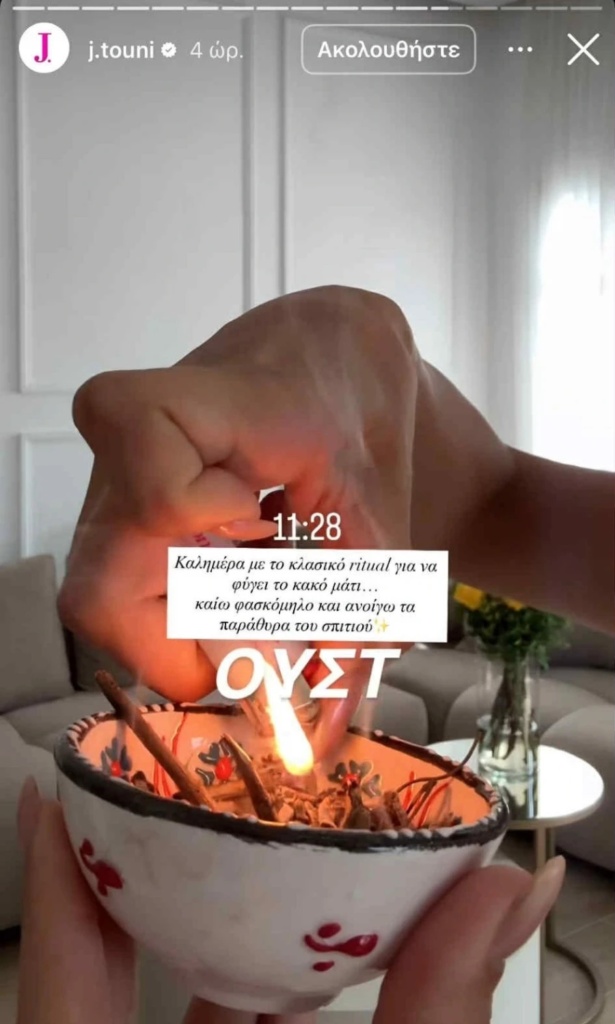Σε βίντεο που ανάρτησε στον προσωπικό της λογαριασμό στο Instagram, η Ιωάννα Τούνη φαίνεται να καίει φασκόμηλο, μεταφέροντας τον καπνό σε διάφορα σημεία του σπιτιού της μια συνήθεια που, όπως λέει, βοηθά στο να διώξει το «κακό μάτι» και να καθαρίσει τον χώρο από αρνητική ενέργεια.