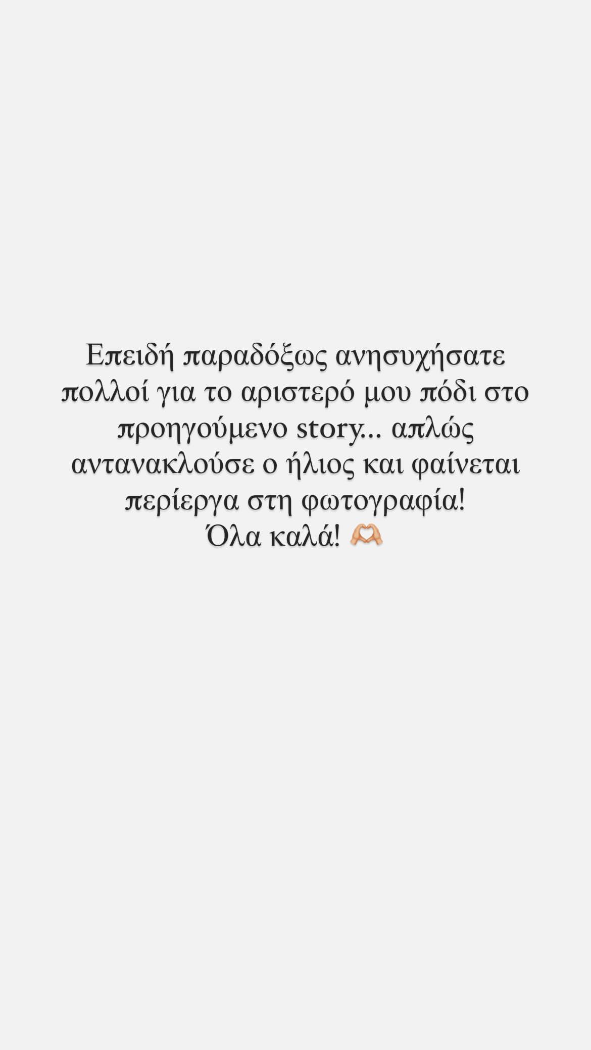 «Επειδή παραδόξως ανησυχήσατε πολλοί για το αριστερό μου πόδι στο προηγούμενο story… απλώς αντανακλούσε ο ήλιος και φαίνεται περίεργα στη φωτογραφία. Όλα καλά».